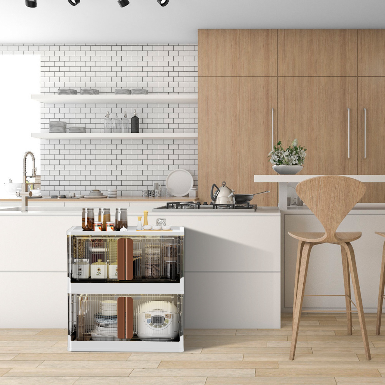 No need tools to install, no need to drill the wall. Free standing storage container with lids and door is a must have for your house. It can stack together steadily to save space. Storage things in a sufficient way by open the lid, and take out things by opening the front 2 doors. Safety latch on the door ensures no falling of your items when moving the bin. The storage containers can be placed in bathroom, living room, kids’ room, kitchen, etc.. Hold snacks, wine, drinks, seasonings, utensils toiletries, towels, skin care products and toys. Side handles and 4Pcs bottom wheels brings you much mobility when cleaning the floor or moving the bins from one room to another. The storage bins with lids come in flat station, just put up 4 panels and tighten them together, and close the lid then you could start to use this folding storage box with doors.