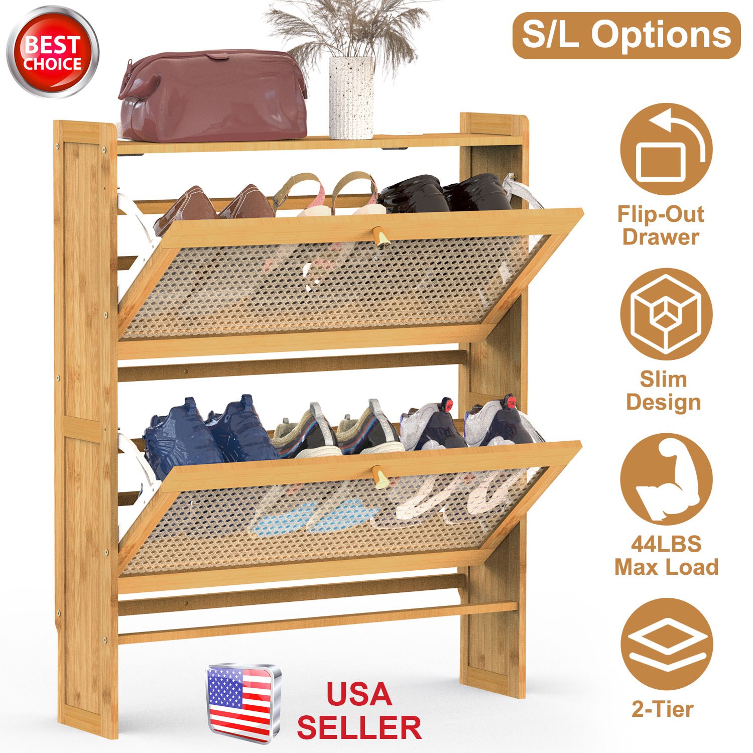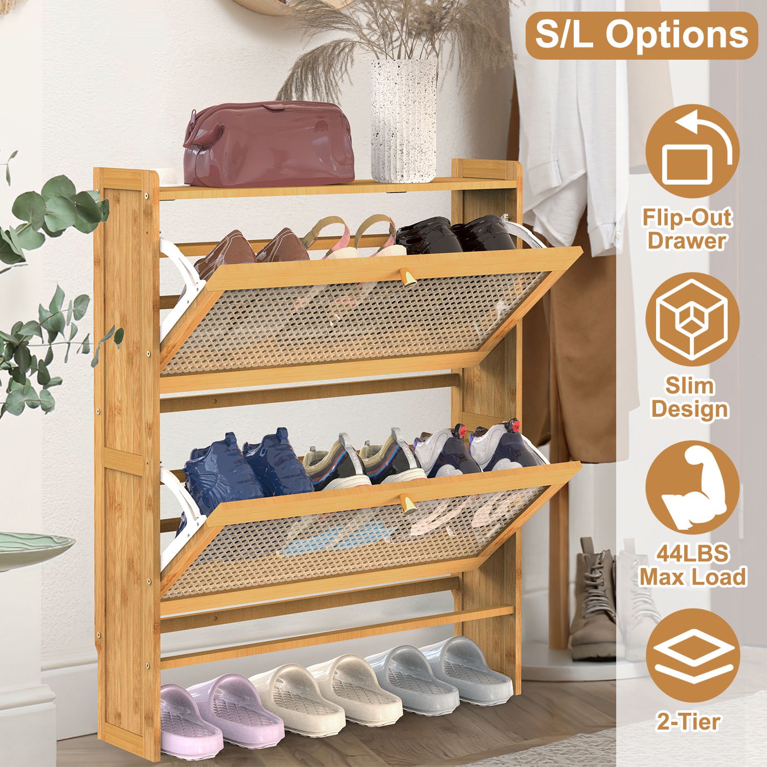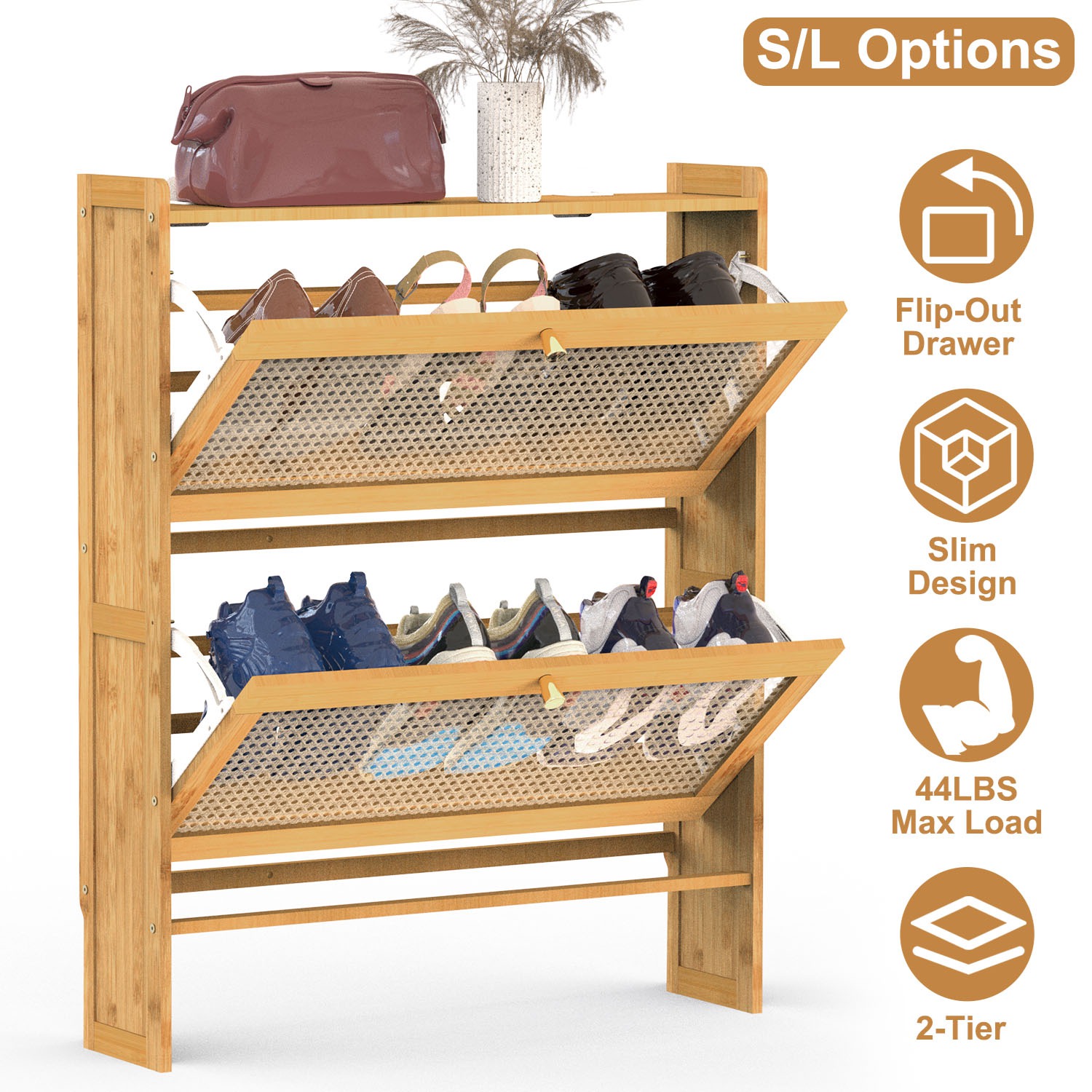 Do you want to store your shoes and keep your entryway tidy in an elegant way? Our 2-tier shoe cabinet is a good choice for you! The natural bamboo material with varnished surface makes it more smoother without burr, looks more classic and stylish, great to match your home decoration. Flipping drawer design makes it easy to open and close and also slim enough for any tight hallway. Able to hold about 6 pairs/4 pairs of shoes with different sizes and store other small items on the top with 44lbs max load. T-shaped buckles make it not easy to fall down, ensuring max stability and safety. And the mesh hollow door panel ensure excellent air ventilation, making your shoe rack always keep dry without smell. Suitable for hallway, entryway, living room and anywhere you like.